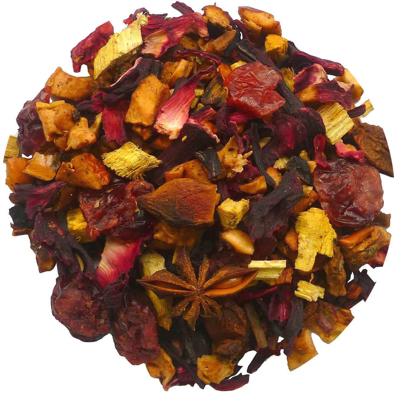 Ingrediënten: appel, hibiscusbloesem, cranberries, zoethout, kaneel, steranijs.