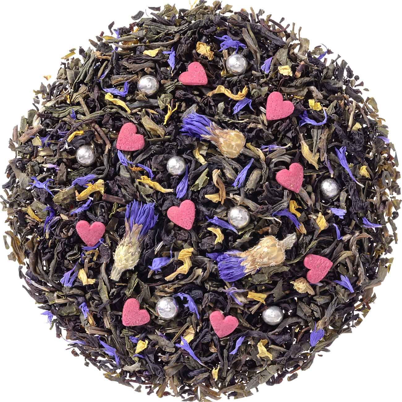 Groene-, witte- en zwarte thee, suikerhartjes, suiker parels, korenbloembloesem, en goudsbloembloesem.